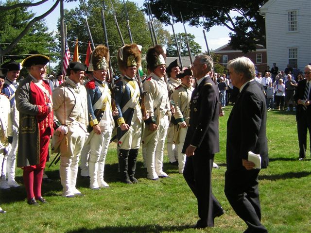 French Major General Pascal Vinchon reviewed re-enactors of several Revolutionary-era French regiments at the Lebanon Green in Connecticut in 2005 October.